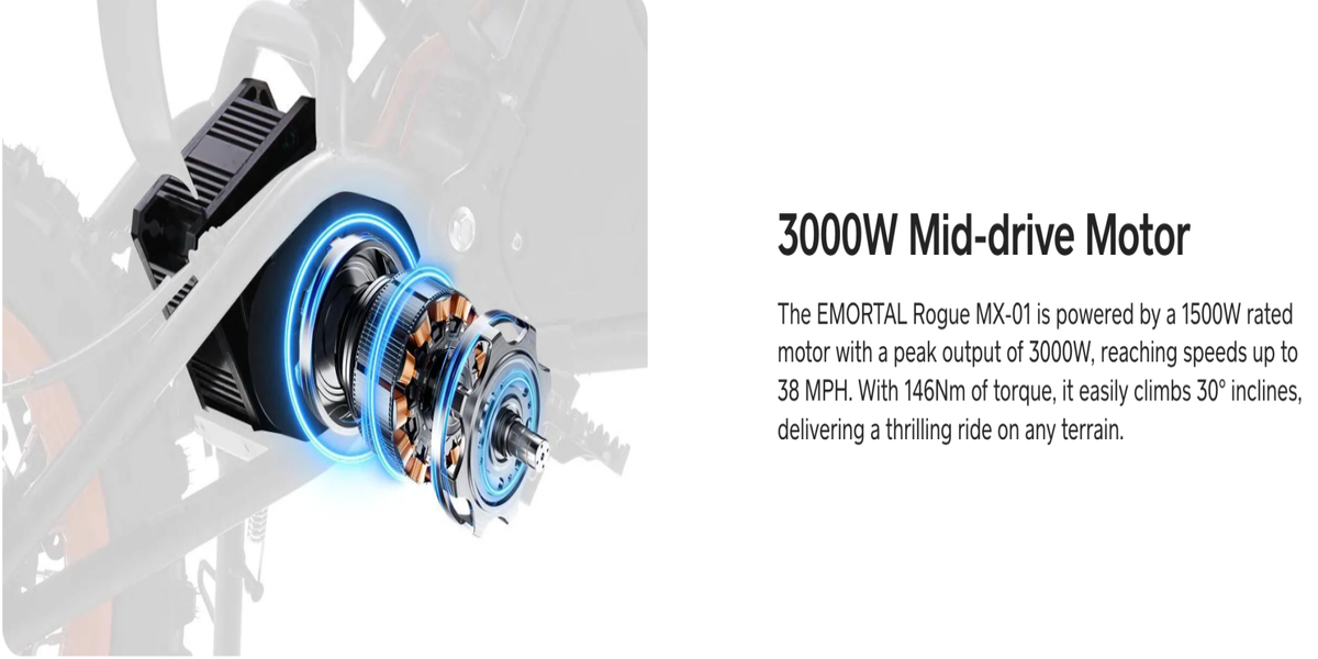 - Motor: 3000W Mid-Drive Motor (Peak)